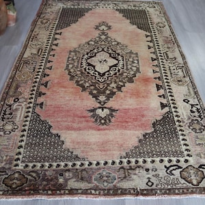 4'x6'2'' Vintage Milas Rug: Faded Beige area rug, geometric anatolian patterns.
