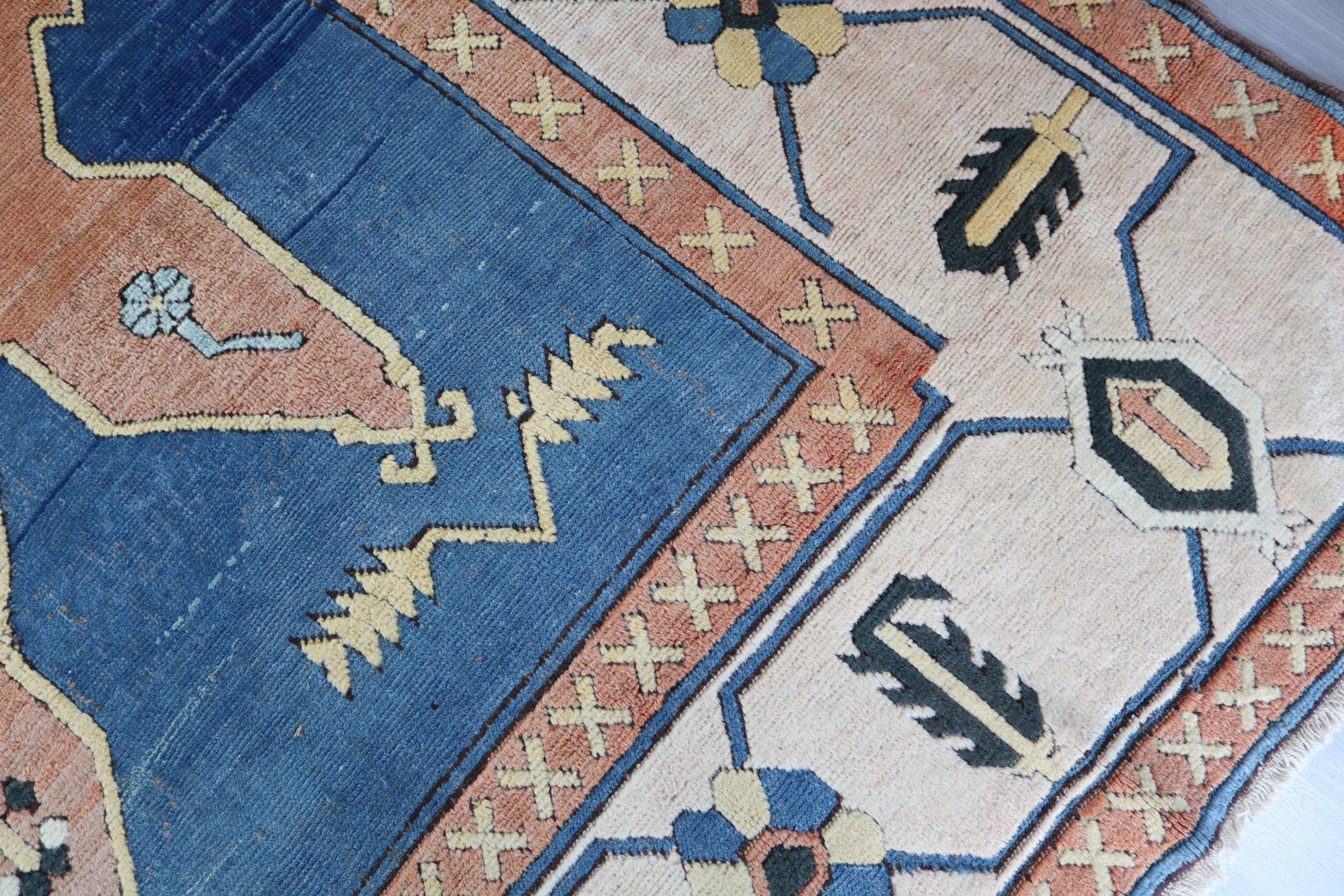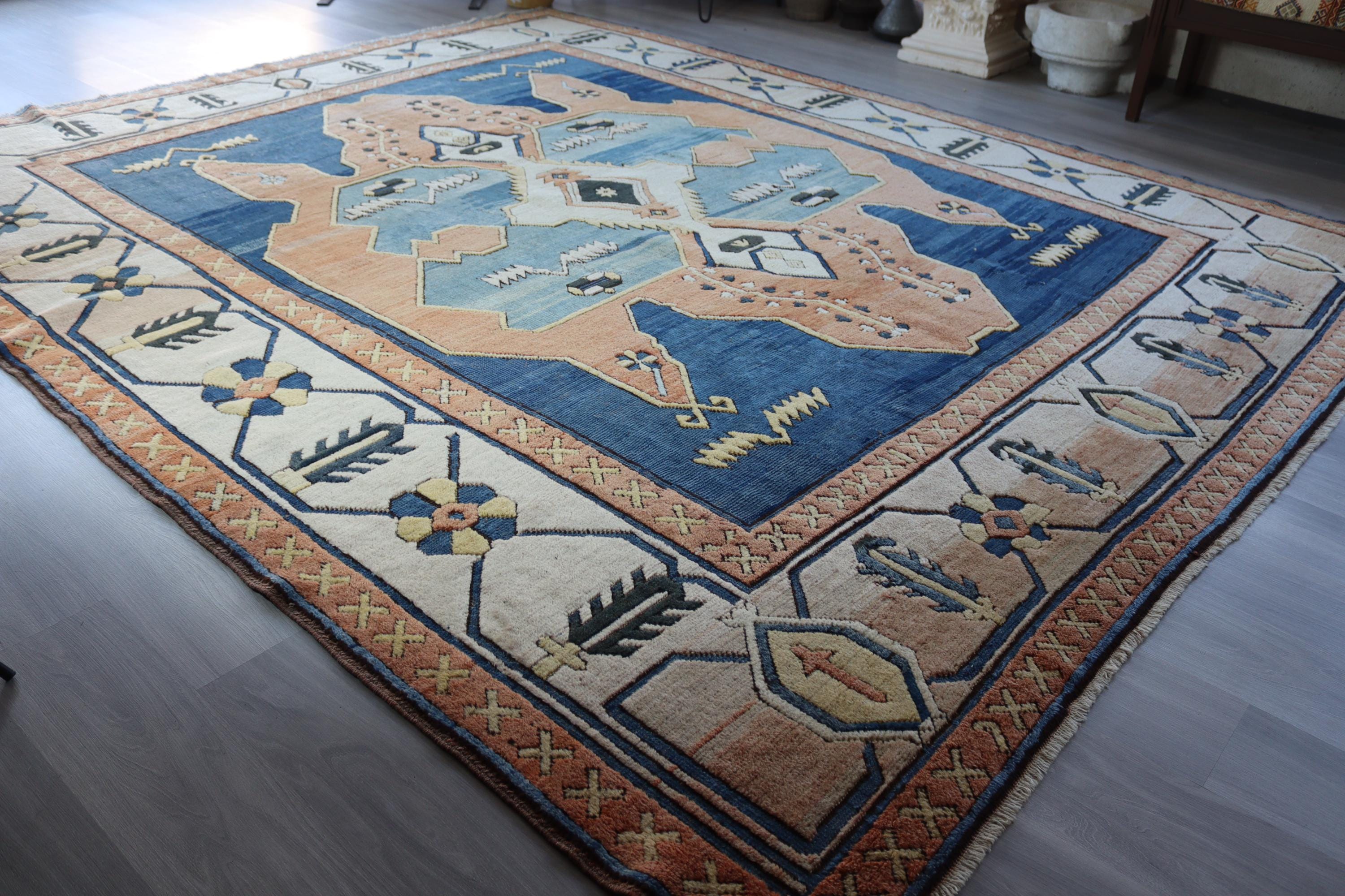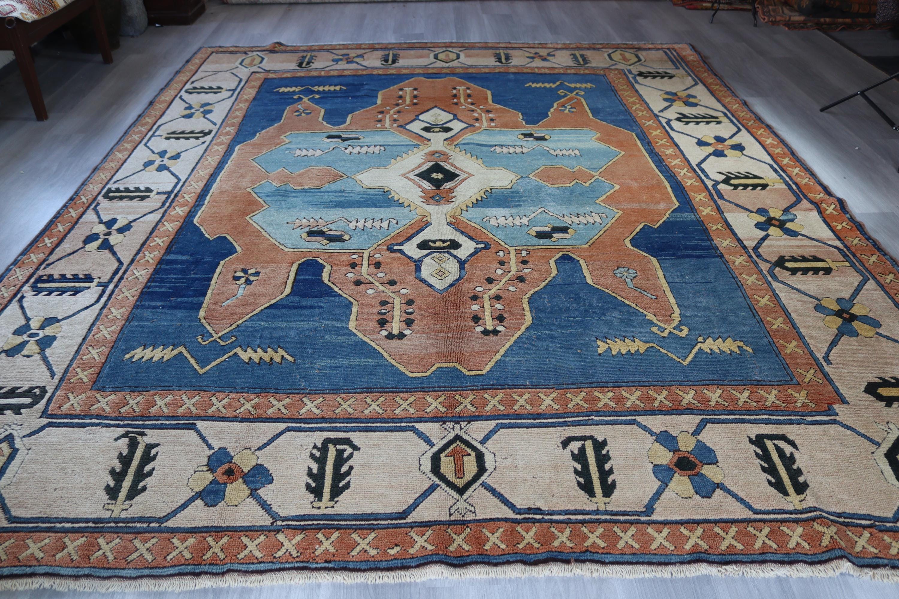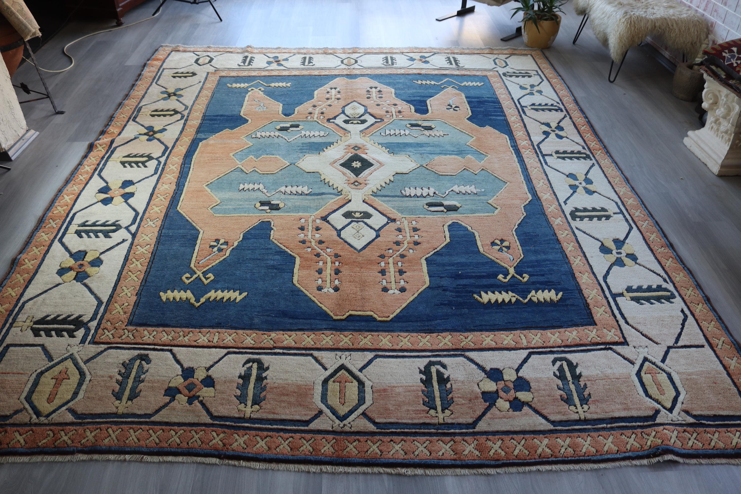 Blue-Salmon Rug, Large Area Rug, Vintage Turkish Rug , Geometric Rug, Medallion Rug / C- 6206 / 9'8''x11'9''
