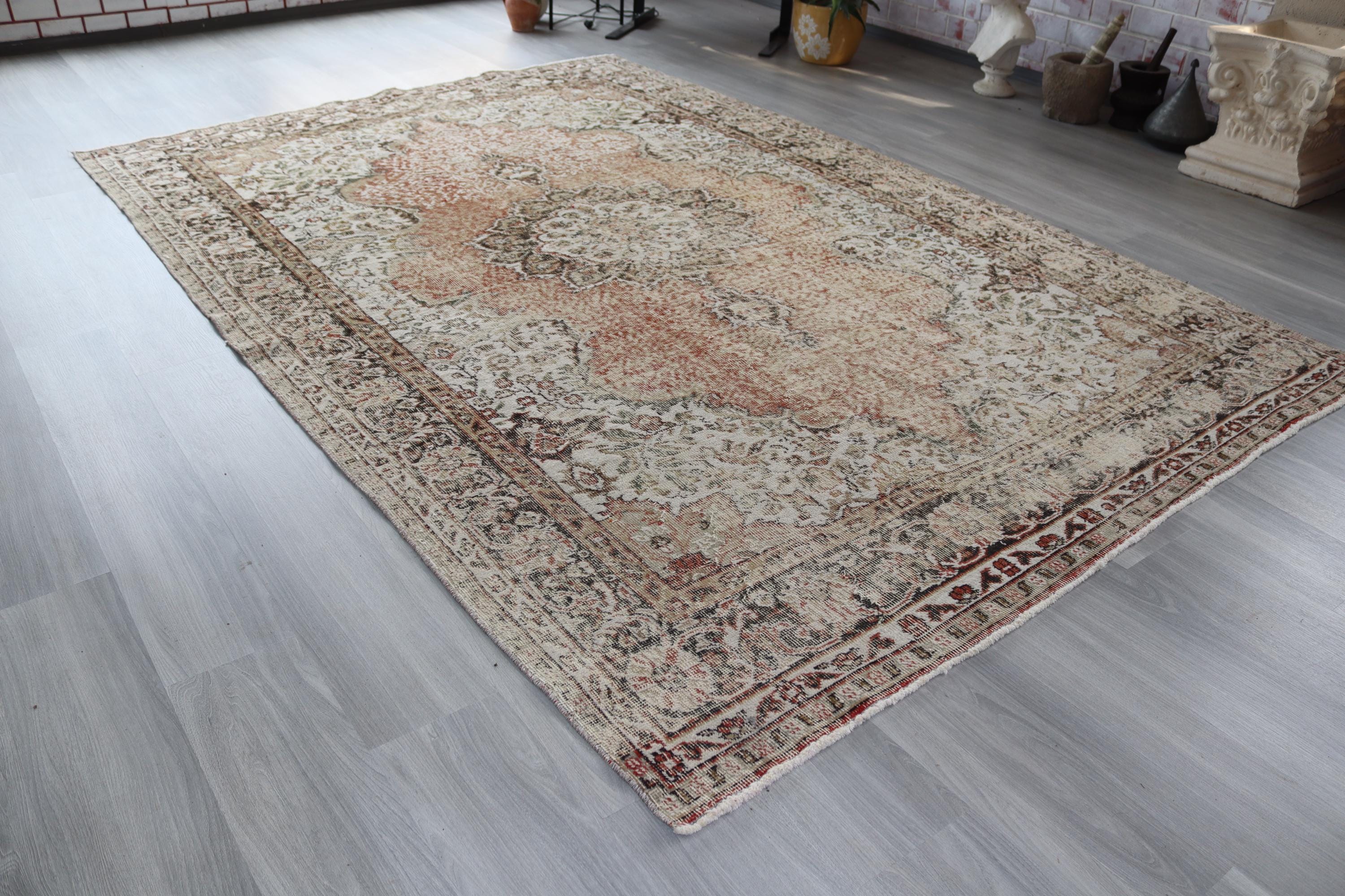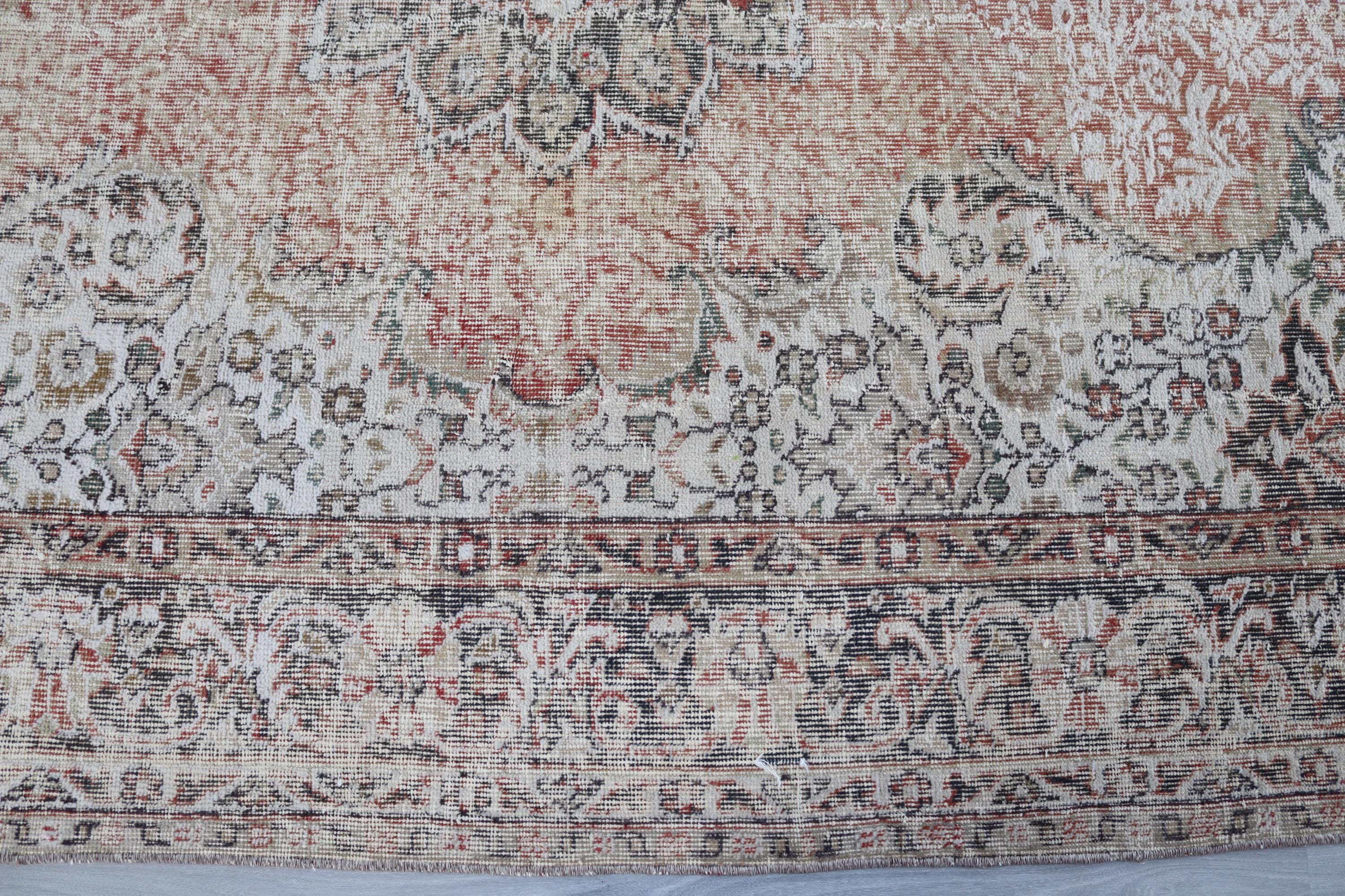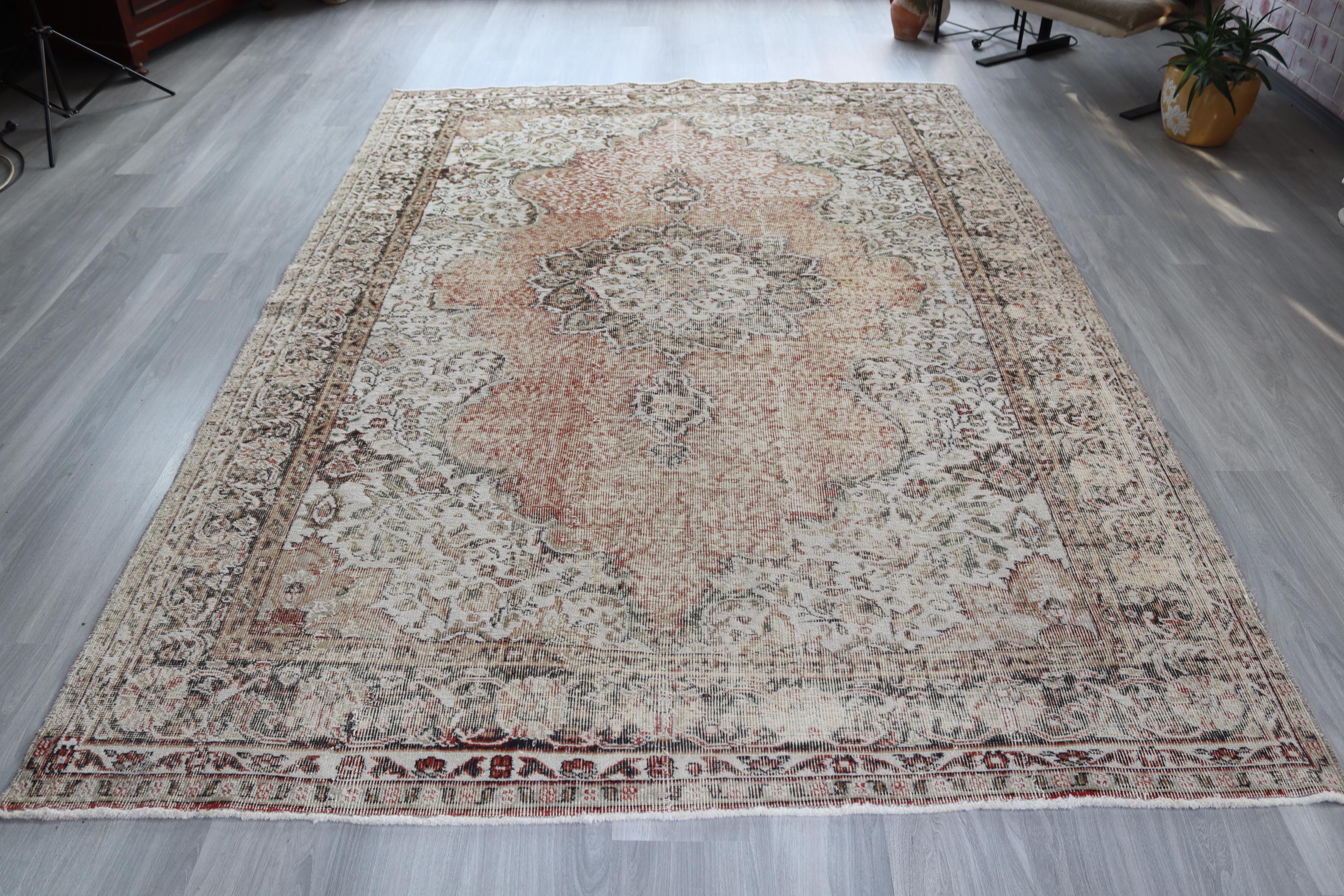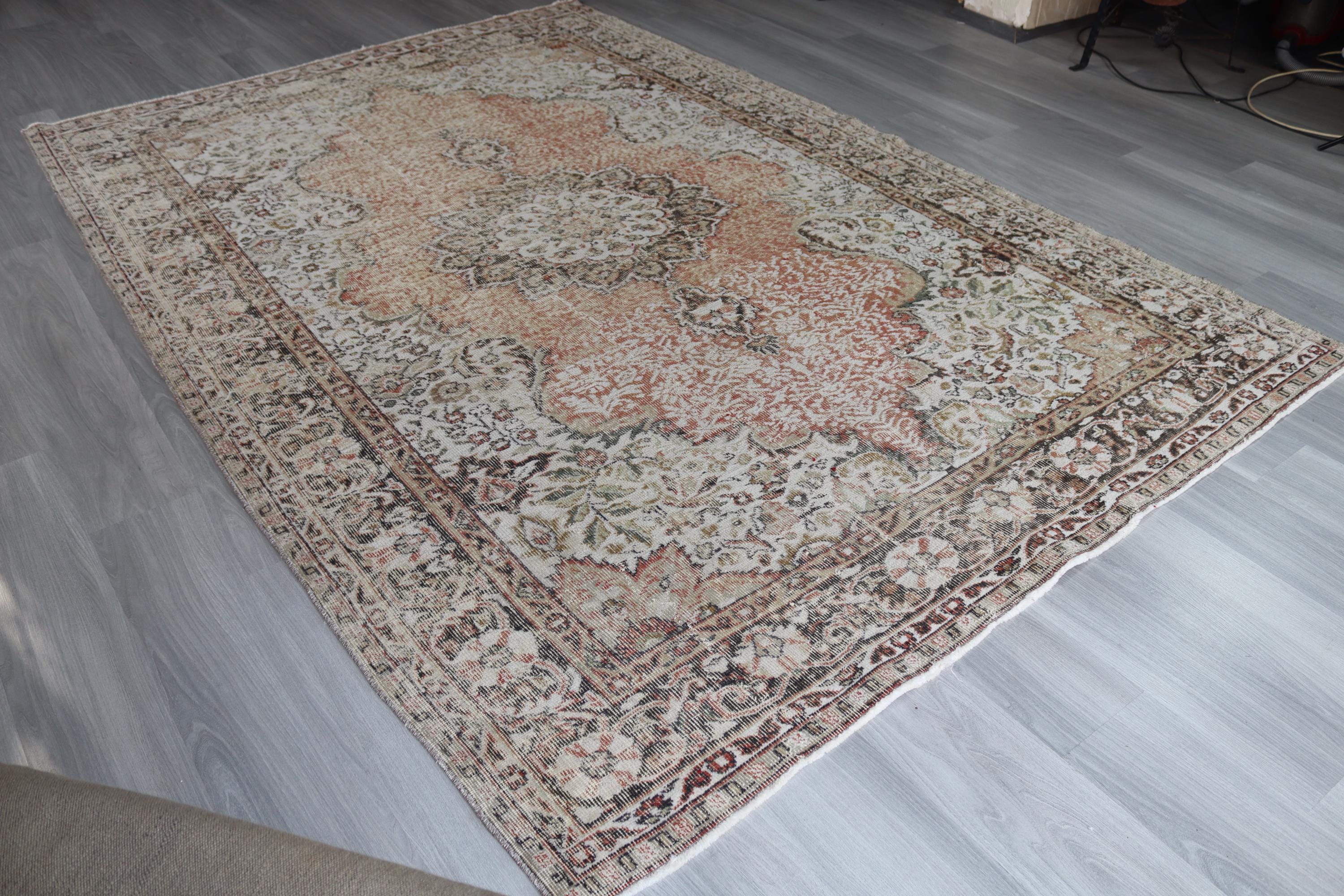 Muted Floral Medallion Low Piled Oushak Rug , Large Vintage Rug , 6'7''x10'1'' / C-6293